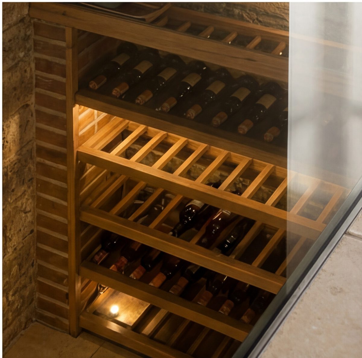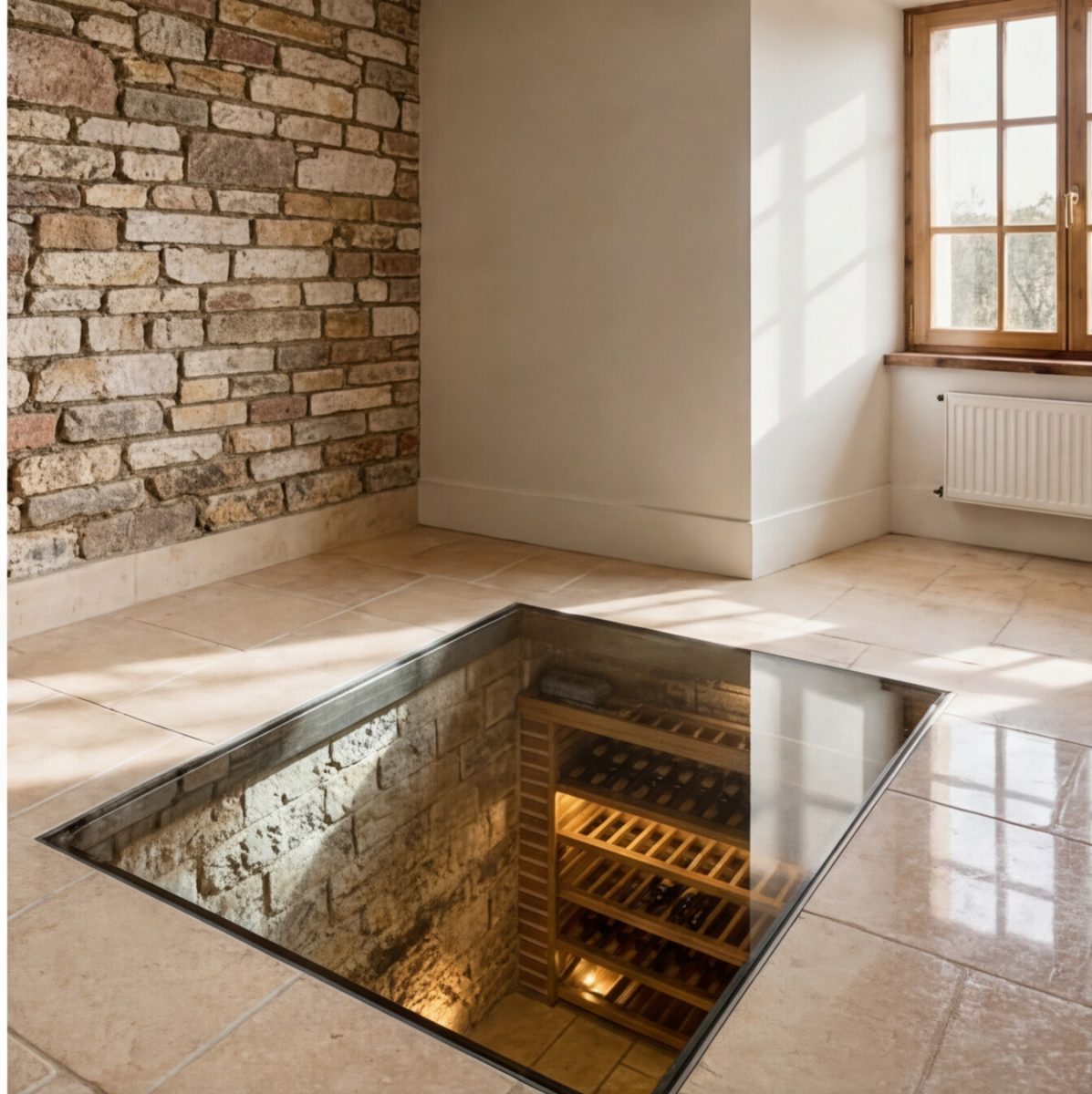 Cave à vin, cave voûtée, espace de stockage ou simple volume ancien… Le plancher de verre devient une fenêtre sur l’histoire de la maison.